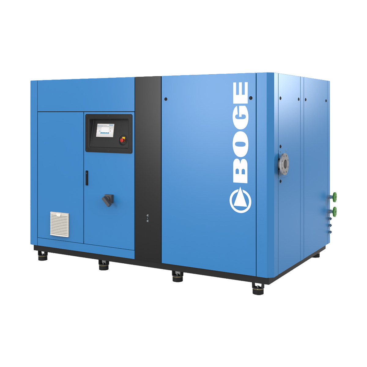 Her skjer komprimeringen i to trinn med mellomliggende kjøling for å senke temperaturen. Trinnene er sammenkoblet via girkasse og arbeider helt uten smøremidler – ideelt for kontinuerlig drift.